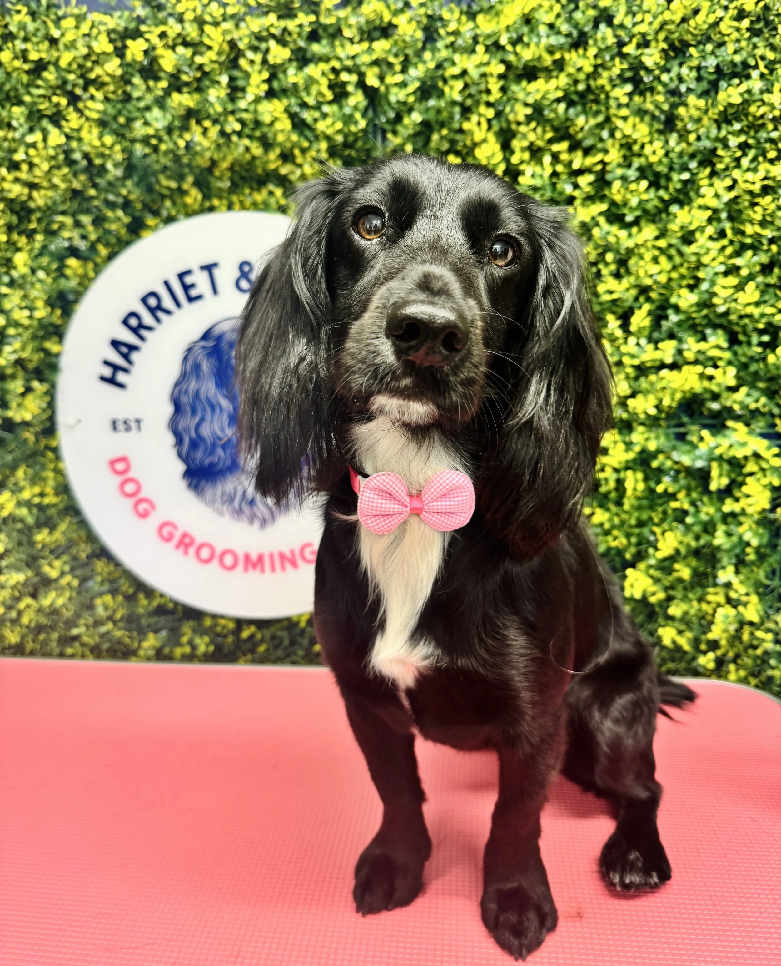 Each groom includes a warm bath, gentle blow-dry, thorough brush, and a full body or breed-specific clip with a neat scissor tidy. We also include a tail tidy, styled face trim, nail clipping, paw pad tidy, and an ear clean — finished with a spritz of cologne for that fresh, salon look.